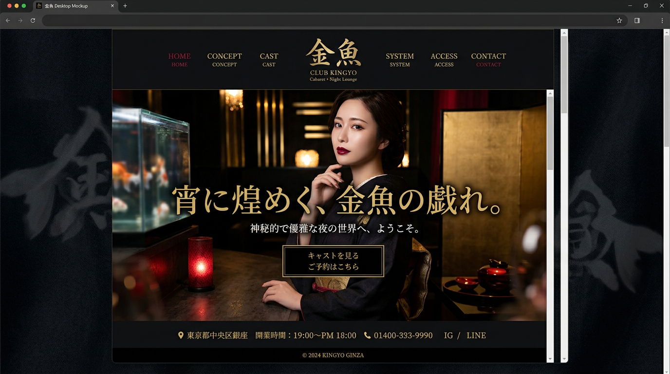 和モダンをベースにした個性派キャバクラLP。深紅×黒×金のコントラストが印象的。
