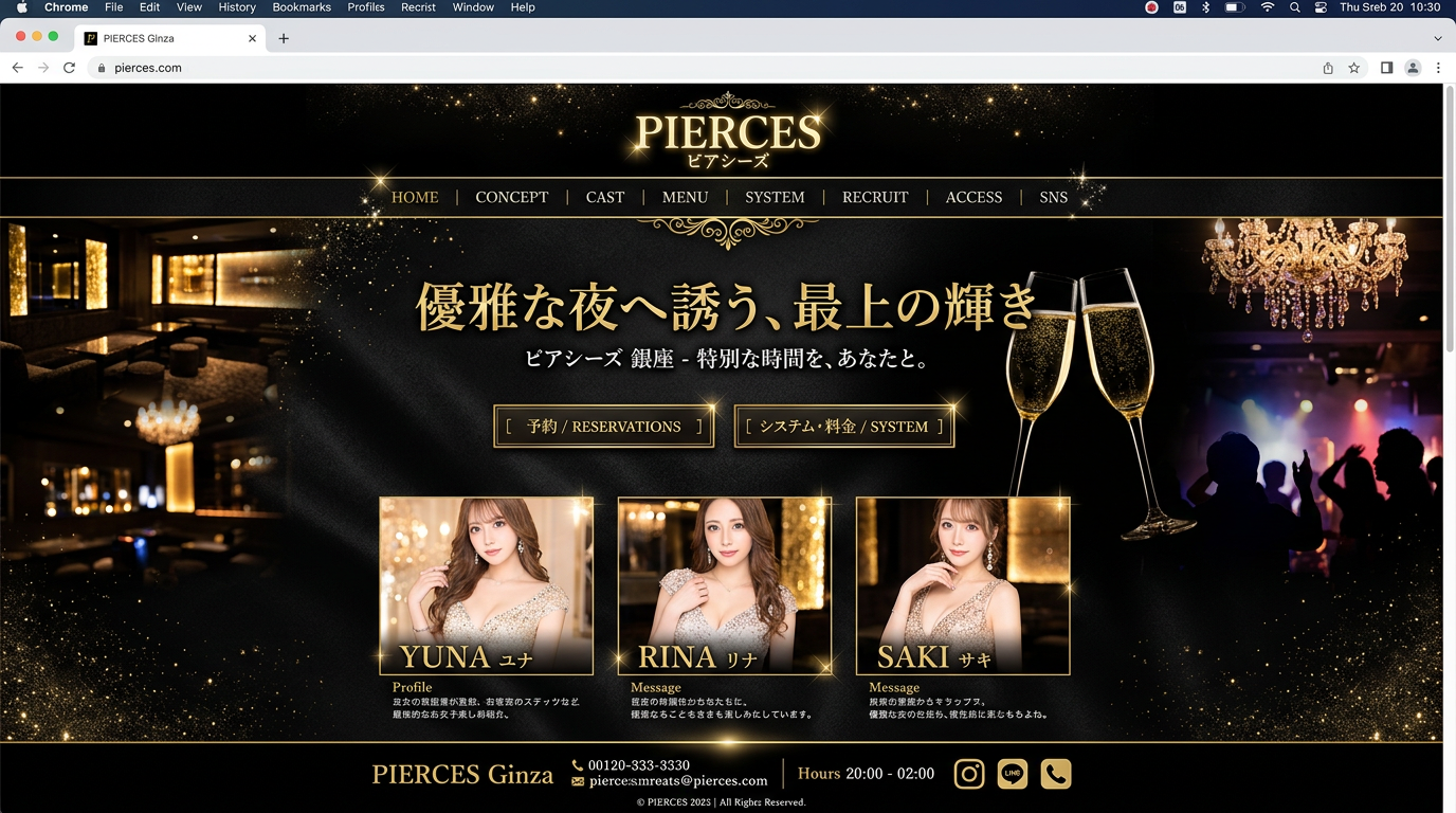 キャバクラ・ラウンジ向けWebサイトのデザインサンプル集。ここから選んでカスタマイズ、最短3日で本番公開できます。
